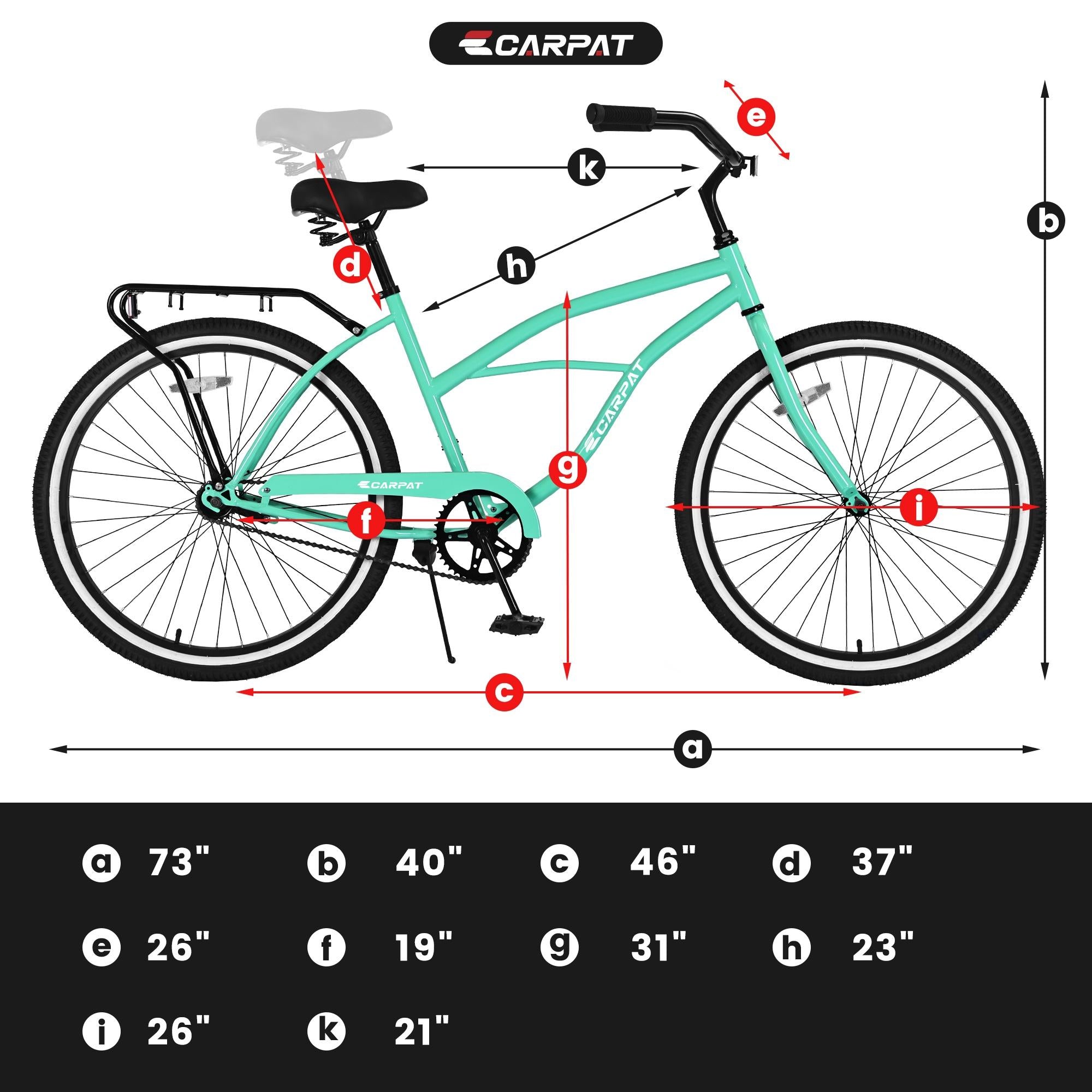 Our cruiser bike measures: 73” L26” W40” H, equipped with 26” wheels and an adjustable bike seat, making it suitable for adults of all heights. The rear cargo rack conveniently accommodates your essentials, while full fenders guarantee a clean, mud-free ride.