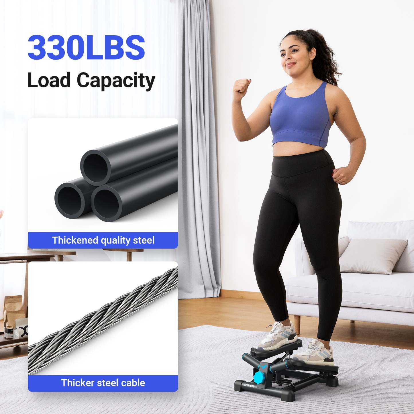 Built to endure over 160,000 cycles, this mini stepper offers long-lasting performance. Plus, it is constructed with reinforced steel and sturdy cables and supports up to 330 lbs, providing security and stability during use.