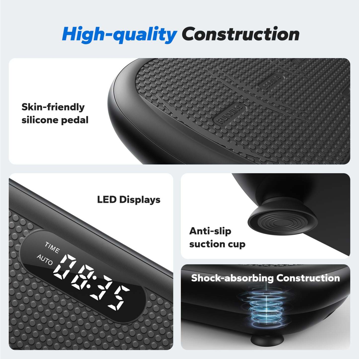 With 10 preset modes and 2 resistance bands, this full-body vibration machine for weight loss lets you train every major muscle group. The remote with LED display makes intensity adjustments simple, while Bluetooth connectivity and built-in speakers let you enjoy motivational music during workouts.