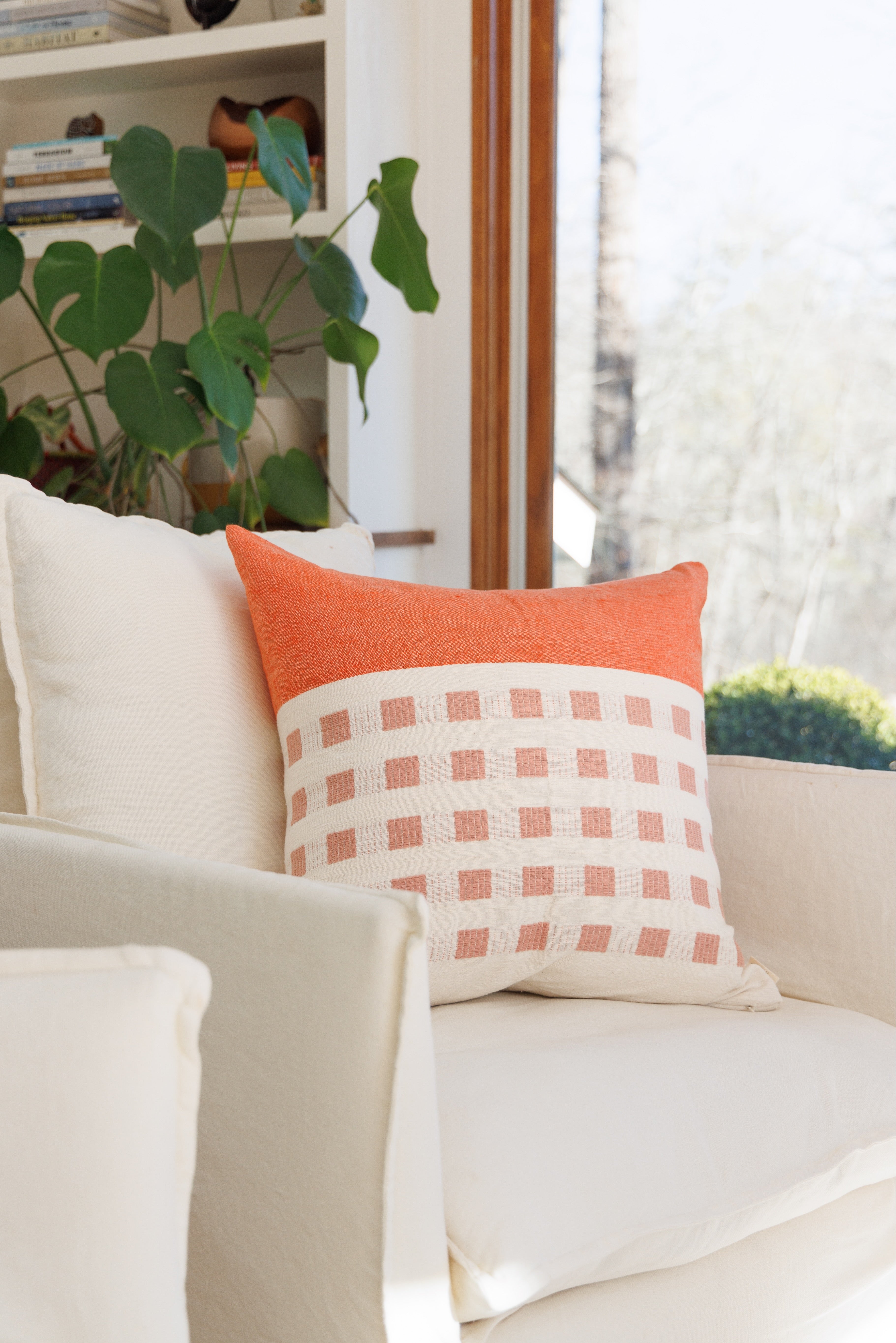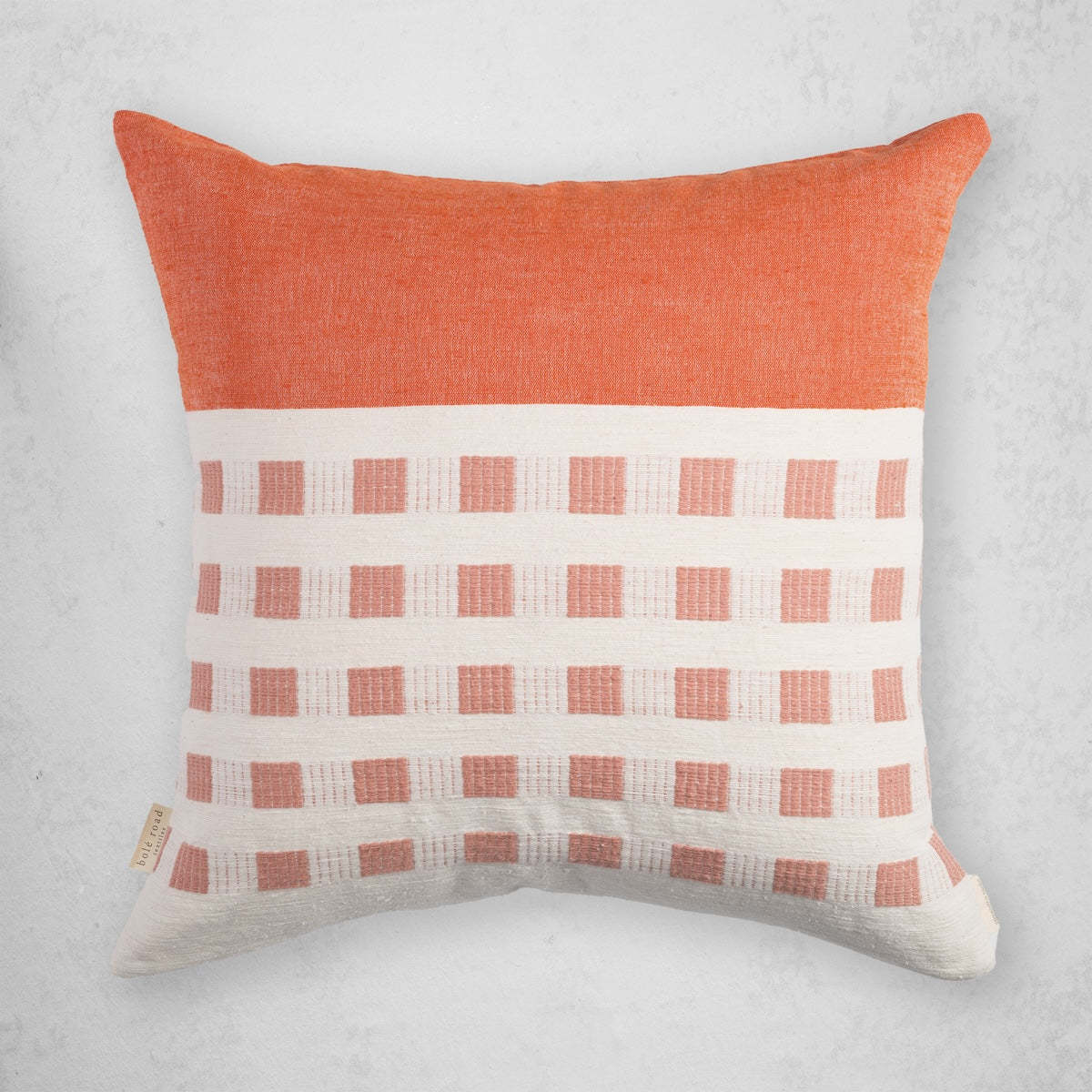 - Handwoven in Ethiopia - 22��x22��?- Tangerine, blush, natural - 100% Ethiopian Cotton - 100% Cotton lining - Lush alternative down insert included - *Reversible, pattern on front and back