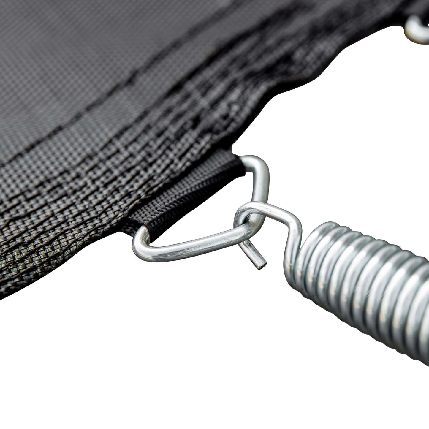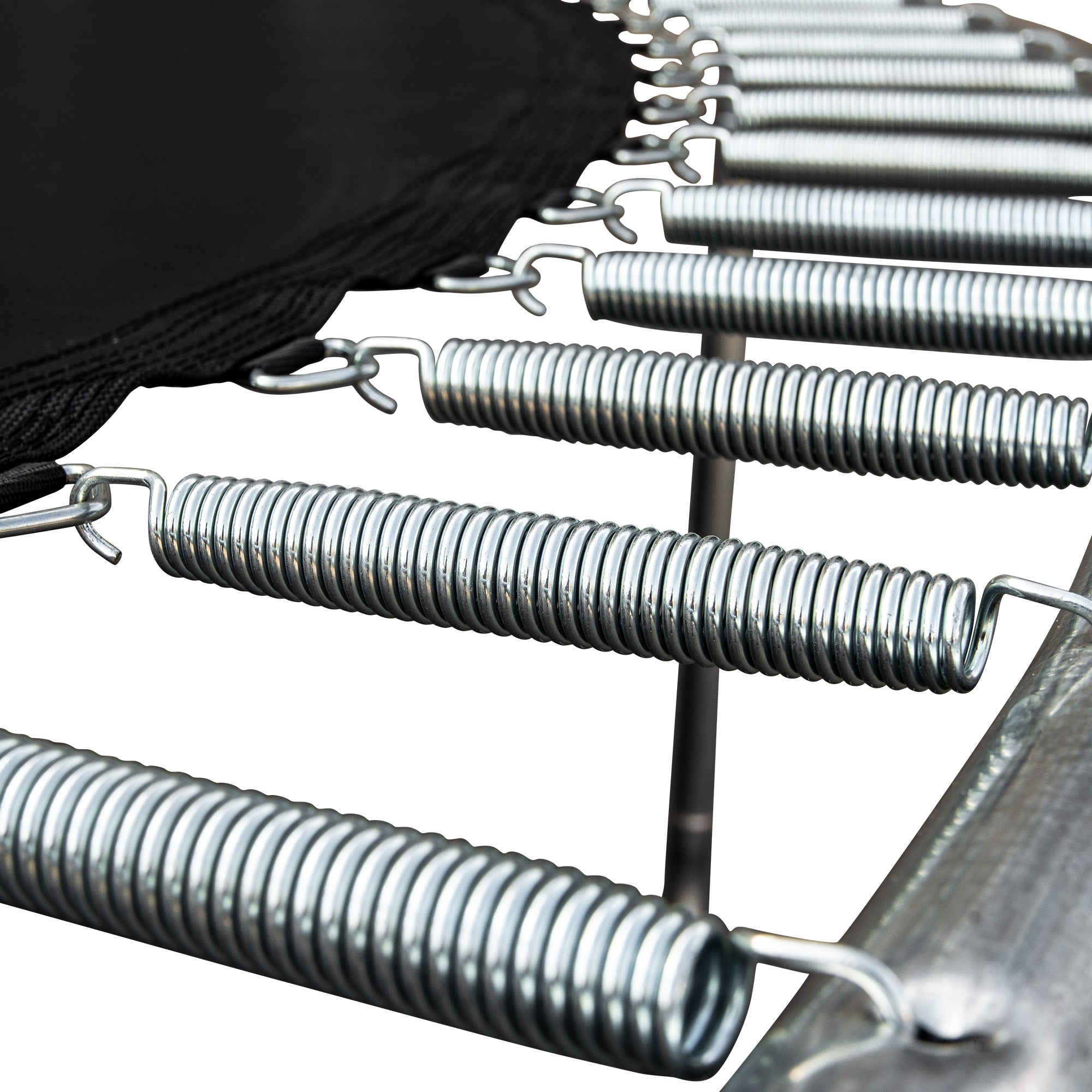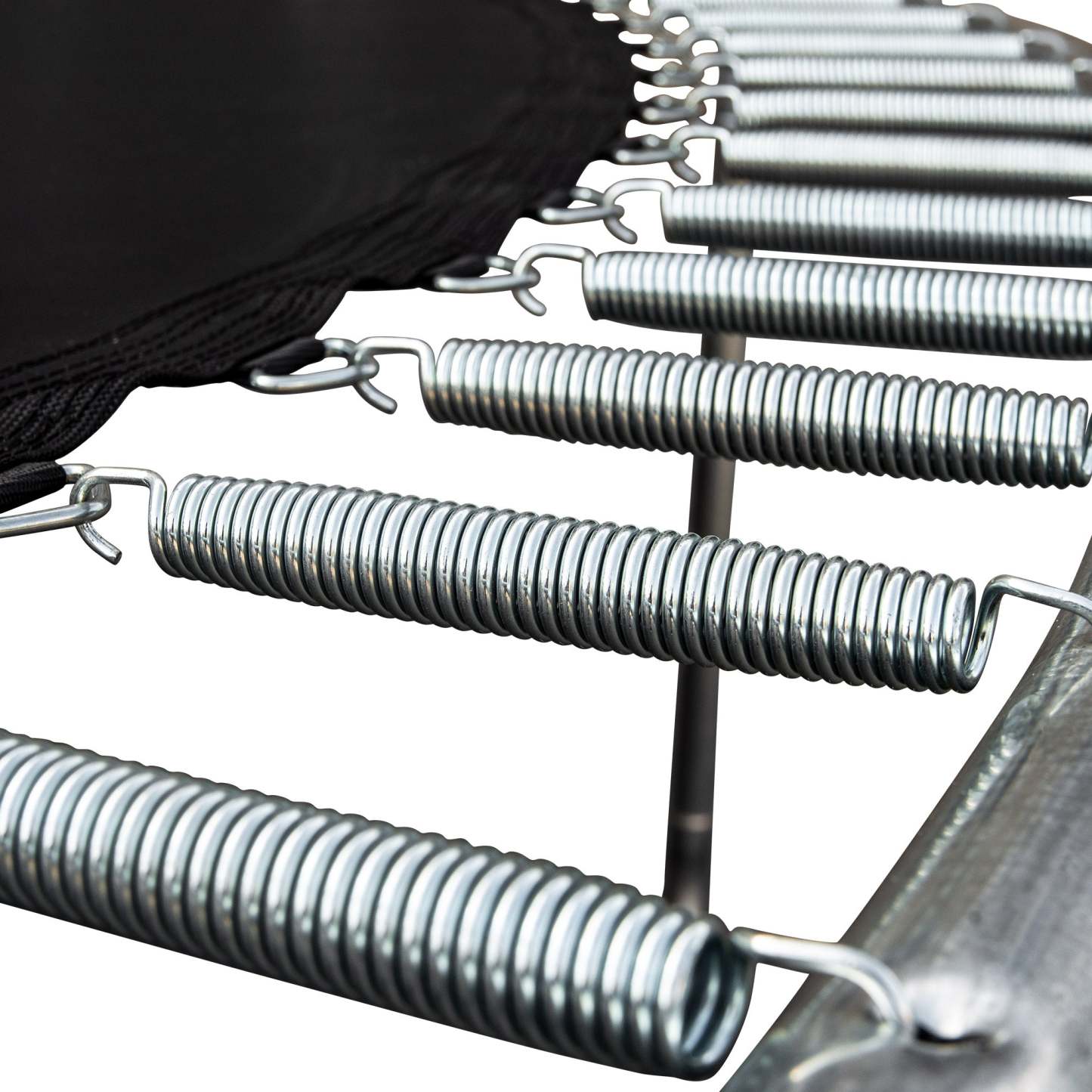 Thanks to heavy duty galvanized steel frame, 6 U-legs and 108pcs galvanized 7'' springs, the trampoline is sturdy and can afford 375 lbs maximum weight limit.