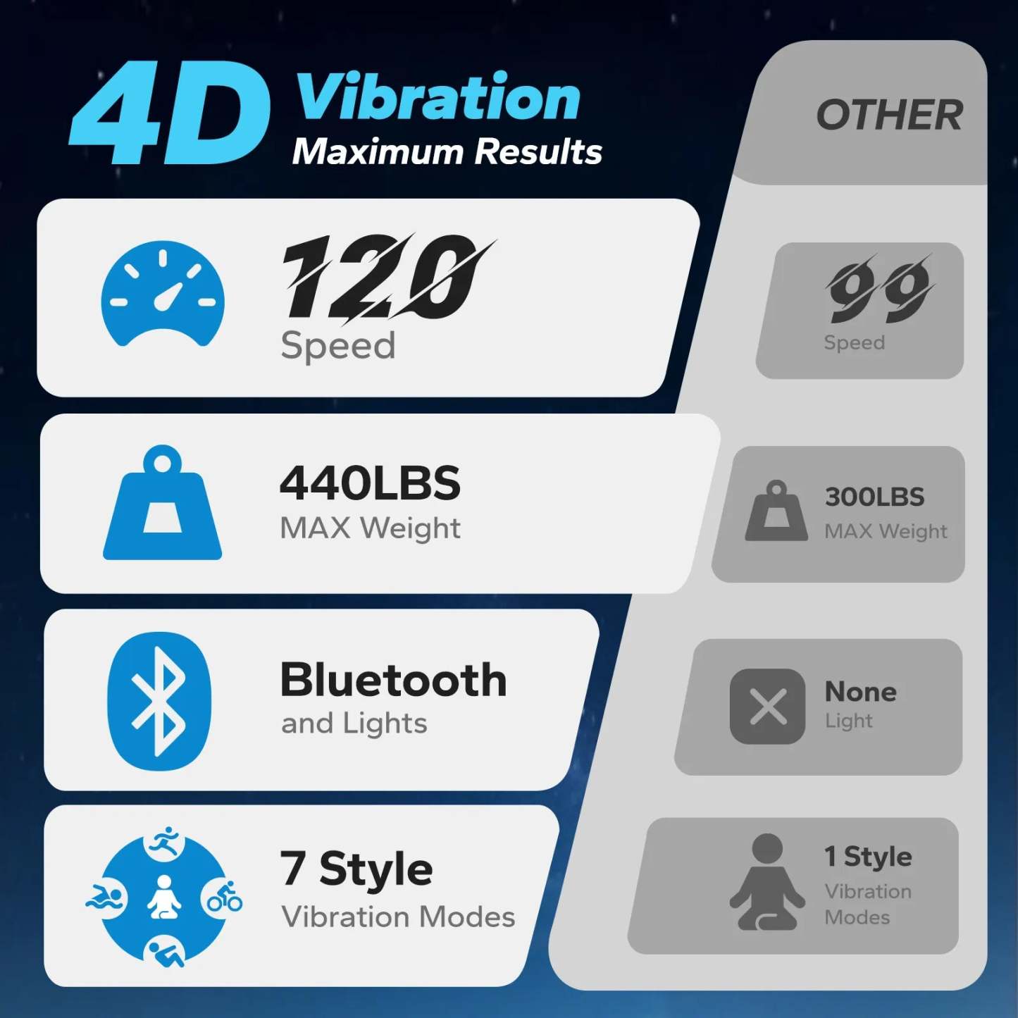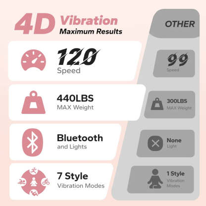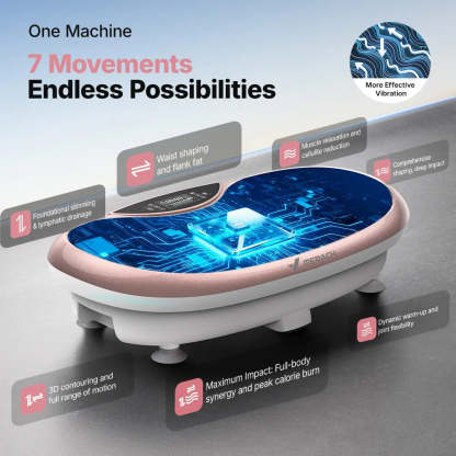 This 4D vibrating workout machine combines oscillation, lateral, pulse, and full 4D motion to triple your training efficiency. Choose from five automatic programs to easily target specific muscle groups and achieve balanced, full-body results.