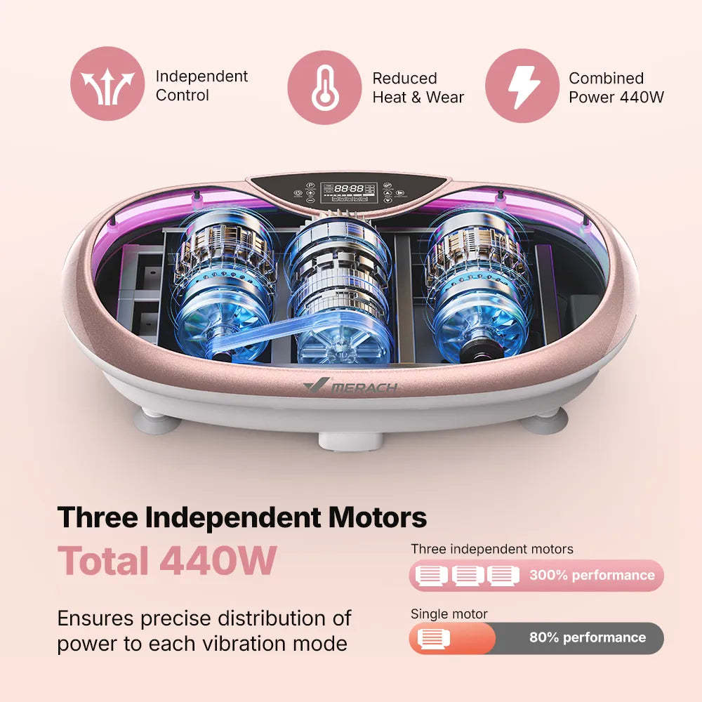 The SurgeVib V55 4D Vibrating Workout Plate is equipped with three independent, whisper-quiet motors that deliver a total of 440W of power for long-lasting, high-performance operation. It supports users up to 440 lbs, ensuring stability and durability throughout your sessions.