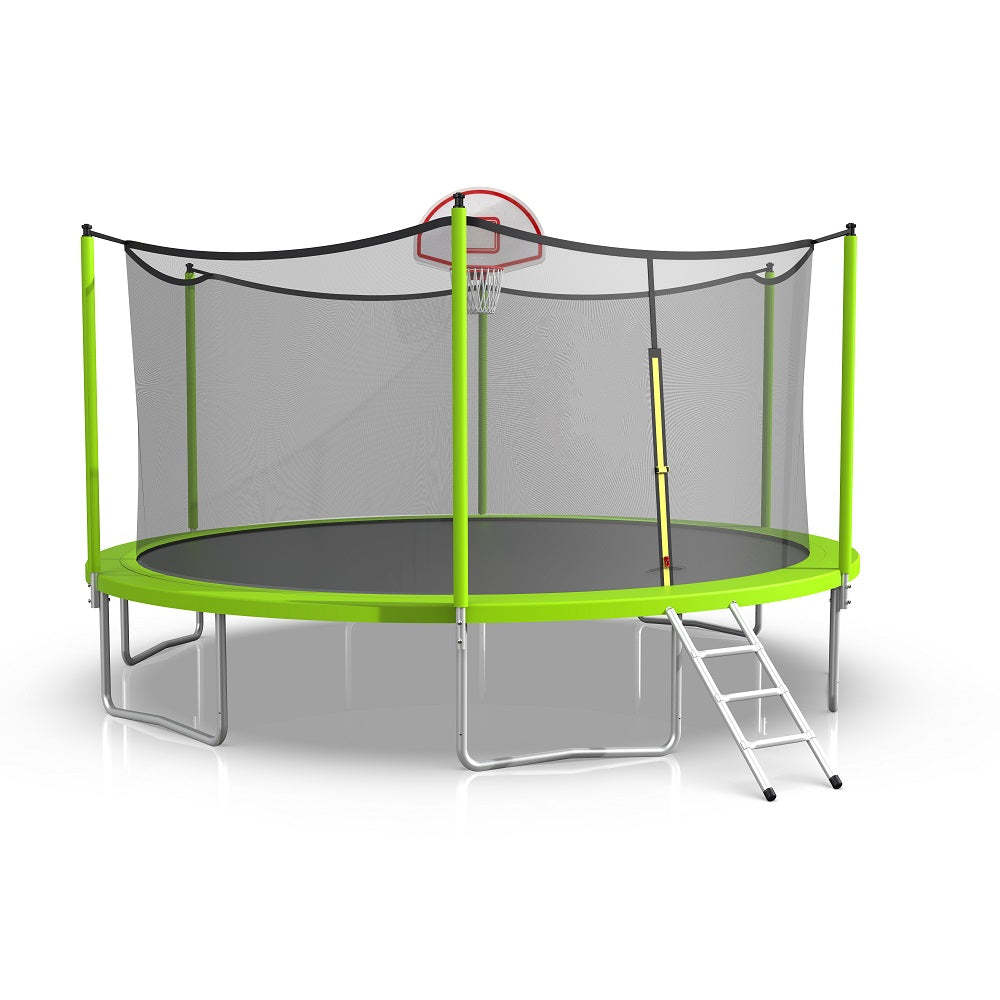 Kids young and old will love the trampoline! The 16' round trampoline with enclosure is the perfect addition to any backyard! This traditional round trampoline is a great fit for growing children because it gives them plenty of jumping space while still providing a great bounce. This trampoline also features a no-gap enclosure system that interlocks the jump mat and enclosure net at each spring, eliminating dangerous gaps. The framework is made of weather and rust-resistant steel, providing extra protection for years to come. The 16' round trampoline with basketball hoop will provide hours of fun for the whole family, and create lasting memories you will not forget!
