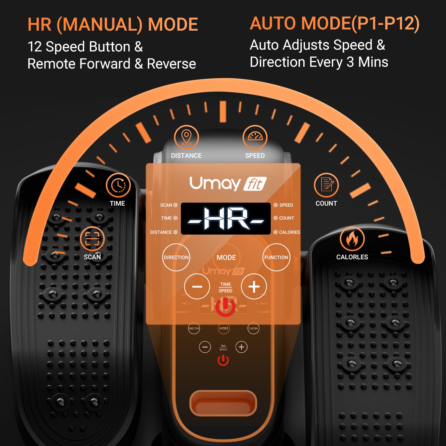 - Auto & Manual Modes: UMAY elliptical provides Auto & Manual Modes for you, elderly people can choose 1-4 levels of low speed for leg exercise and relaxation. In Manual mode, you can set workout time of 15-30min, 12 speeds and forward&backward direction by remote control or button of the elliptical machine. The speed and direction have been programmed in Auto mode, you can adjust P1-P12 mode by press mode button, the speed changes every minute and the direction changes every 3 minutes